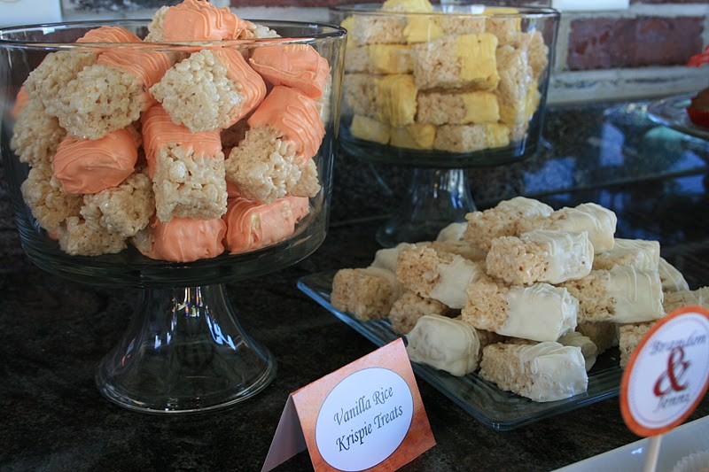 They had the reception at their private pavilion next to their cozy country home. The setup was beautiful with the rustic wood and brick complimented by the gorgeous granite! It made for a really great background for the dessert bar. The theme we were working off of was "Autumn Inspirations" so naturally the party planners chose Pumpkin Spice Cupcakes with Honey Cinnamon Cream Cheese Frosting. For a chocolate element we threw in some Chocolate Fudge Cake Pops tied with some festive fall colored ribbon and added some delicious Rice Krispie Treats Dipped in Vanilla because....Why Not?! It was beautiful.